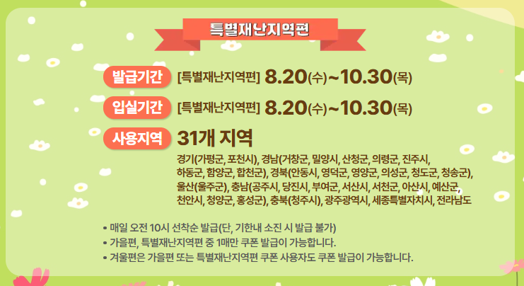 - 특별재난지역편일 경우 최대 5만원 할인 등 추가 혜택이 제공될 수 있습니다.