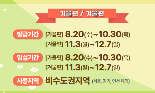 - 가을편: 8월 20일 ~ 10월 30일 입실 가능